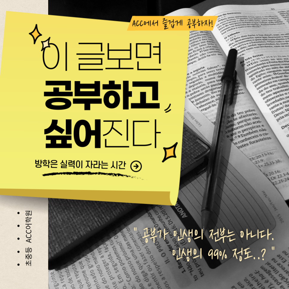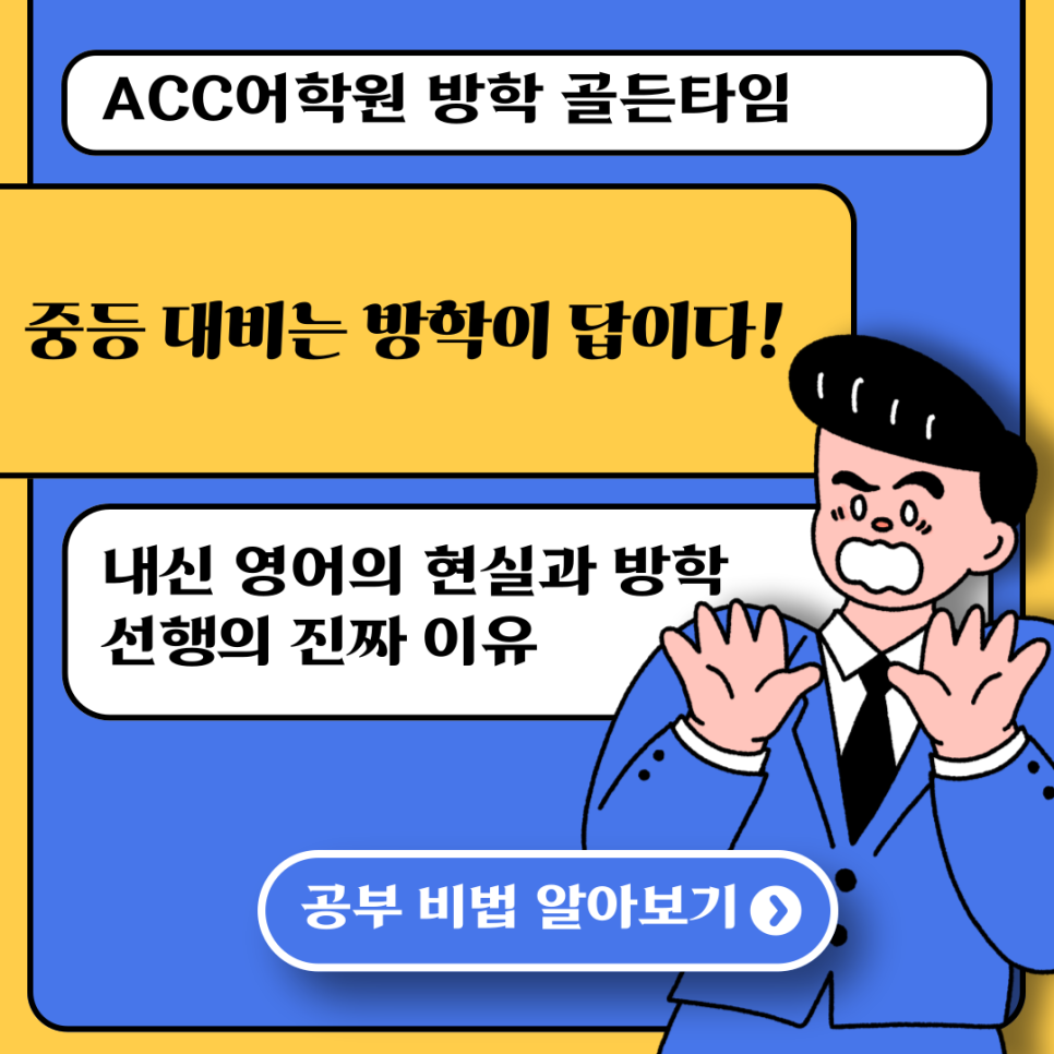 새 학기 영어가 걱정된다면, 시작은 지금이 딱 좋아요. 새 학기 적응이 쉬워지는 영어 수업 ACC어학원에서 만나보세요. "방학 때까진 괜찮았는데요…" "작년엔 잘 따라가던 영어가 왜 이렇게 힘들어졌…