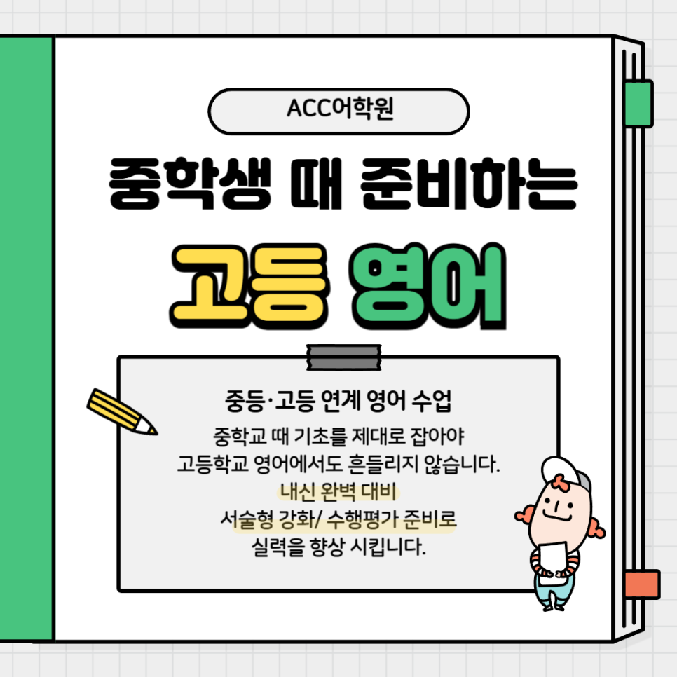 ACC어학원 중등 · 고1 신입생 모집 중학교 때 영어 성적이 괜찮던 학생이 고등학교에 올라가 갑자기 영어가 어려워지는 경우가 많습니다. 많은 학부모님들이 이렇게 말씀하십니다. "중학교 때는 영어를…